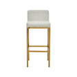 The Baina bar chair boasts faux white leather upholstered seat and low back rest. The foam padding and metallic footrest adds an extra layer of comfort to your seating experience. The sleek and sturdy gold finished metal legs complement the clean silhouette of this luxe bar chair, making it ideal for your home bar, kitchen counter, or pub.