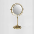 The Cassini table mirror is made from tough iron and has a reflective gold finish. Secured in a sling, one side of the mirror features 2X magnification. A black switch at the top operates the LED light.