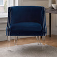 The Clarence chair boasts a stylish design with sloped armrests and curved backrest, coordinating with the arched rear legs. Upholstered in rich blue velvet fabric, the chair has a luxurious appeal suitable for luxe style interiors. Silver finished stud detailing lines the edges of the arm and back rests, adding a cool metallic accent.