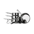 This coordinated set incorporates five differently sized saucepans, a large frying pan, and a milk pan. The three saucepans each have a clear glass lid, with small vents that keep the glass clear by allowing steam to escape.