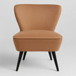 The chair is upholstered with tactile fabric that sports a muted yet warm natural colour. The fabric covers a generous seat and wide, angled backrest. Its plain hue makes this an understated accent piece.