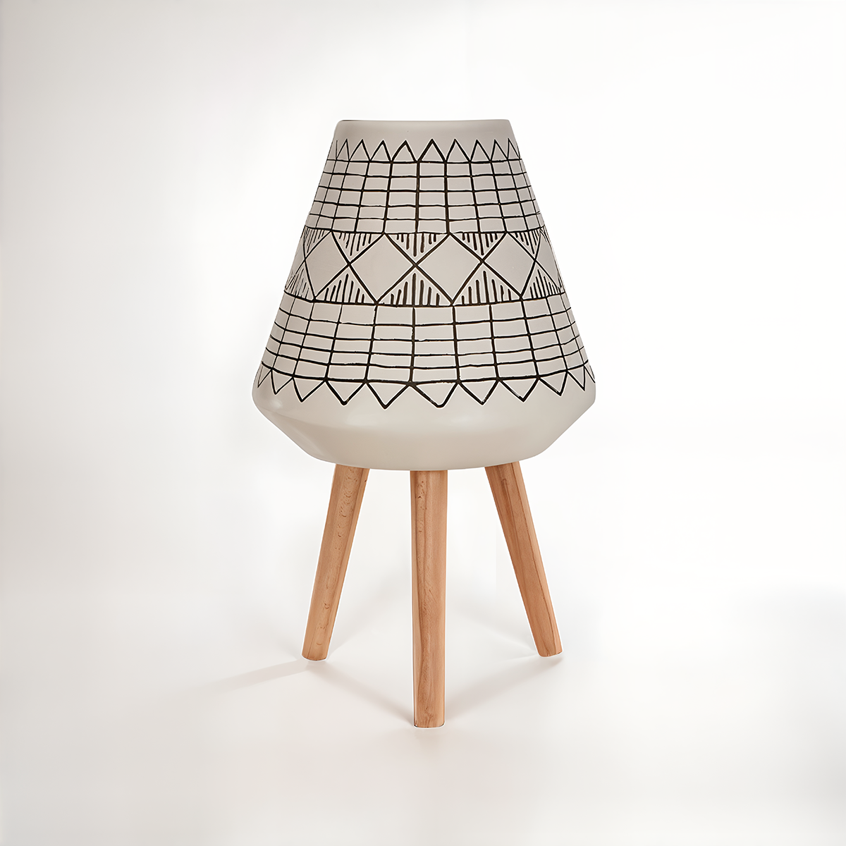 The Darnell stylish planter features an etched pattern in black tone over the crisp white pot, highlighting the artistic details. The reversely tapered quirky pot is elevated by natural finished beechwood legs resembling a tripod. A versatile accent piece, this large planter can be used as a standalone piece to add character to your room or to bring a lush plant to your indoors and outdoors.