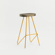 This minimalist bar stool has an ergonomically designed top, crafted from sustainable, eco-friendly elm wood. The gold-finish angular metal frame is attached with a wooden seat, showcasing contemporary elegance. The frame is further supported by a metal footrest that adds stability and offers a comfortable seating experience. This contemporary bar stool is a versatile addition in a variety of interior settings.