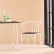 The District elm wood armchair is a contemporary addition in the living room and hallway. This armchair has a sleek and durable metal frame in a white finish, featuring hairpin legs. A wide and rounded backrest with a trio of vertical tubes supports the central section of this chair. This living room armchair's seat has rich grains and a textured finish that complements your home decor.