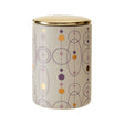 Ideal for dried food storage, this canister is decorated with a space orbs design in assorted colours accentuated by a plain base. It is contrasted by a reflective gold plated lid which keeps the contents fresh with an airtight effect. The rounded edges of the lid contributes to its pleasing visual aesthetic.
