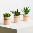 The Fiori set of three mini faux succulents are individually arranged and feature lush green distinctive leaves. The plants are nestled in simplistic ceramic pots which have soft white and pink shade, complemented with a gold finish decorative trim. The elegant blend of pastel hues with lush greenery and a touch of luxury makes this set a chic way to add some pop of colour and natural charm to your decor.