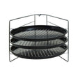 This three tier pizza rack makes baking multiple pizzas easy. The black metal dishes have holes for even cooking, resulting in crisp and golden pizza crusts. The dishes are non stick for quick and hassle free cleaning.