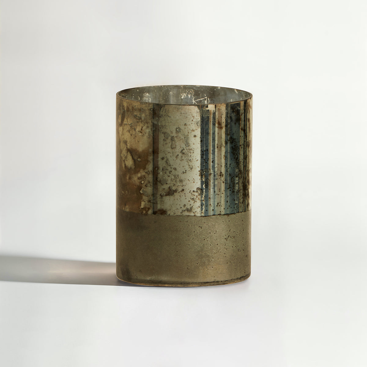 This small cylindrical vase is crafted from black shade glass with a layered design featuring an antique effect top complemented by the marbled round bottom creating a unique burst of textures that capture the viewer's attention. An elegant platform for displaying blossoms on your living room console table or shelf or as a standalone reflective accent bleeding contemporary charm into the interior.
