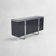 This sideboard has a sturdy MDF build with three shelves. The front features a fluted pattern and grey finish. The grey wood forms a monochrome contrast with the polished stainless steel frame and sledge base.