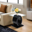 The sleek, clear tempered glass surface is smooth and suitable for displaying plants, lamps, flowers, giving home a personal touch. The striking 'O' shaped base is made from durable MDF and features a black hi gloss finish that accentuates the curved design.