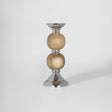 The Hampstead medium pillar candle holder is supported by a reflective metal base, while above it a pair of orbs, made from mango wood, distinguish themselves from the metal. The candle itself is supported by a metal plinth, and this combination of natural materials make the Hampstead candle holder a stylish way of adding a little more light around the home. Crafted by hand, use it to add a decorative piece to the mantle or dining table.