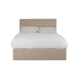 Featuring a stud detail tufted headboard in a linen fabric upholstery, the Hannah beige double ottoman bed is crafted to make a statement while ensuring comfort. The matching button tufting is contrasted by a stud detail outline giving it an elegant visual appeal. Sturdy and stylish, the renewable pine wood frame of the bed ensures strength and provides ample storage underneath.