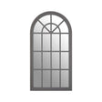 Its frame is made from real wood and has a grey colour which is gently weathered. The rectangular lines are softened by its arcing top section. Bevelled edges combine with carved detail to add depth and texture to this accent piece. Slim strips of wood are positioned on the reflective surface to create a series of mirrored panels.