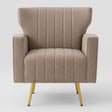 This armchair has a modern retro style with a winged back and mink velvet upholstery. The vertical channel tufting on the seat lends a decorative detail to it. The slanted legs enhance the visual appeal of the armchair.