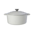 The Hygge large casserole dish is made with durable cast iron featuring a glazed coating in muted white giving it a smooth finish. The casserole dish has a matching lid with knob handle and side handles for a secure grip.