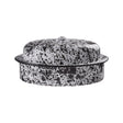 The Hygge oval roaster is made using enamelled carbon steel and features a splatter effect in black and white on its exterior surface. The extended rim in black finish complements the decorative monochromatic pattern. Its sturdy side handles ensure a secure grip while carrying it to the dining table.