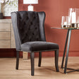 Kensington Townhouse black velvet dining chair with padded seat featuring stud trim with button tufted winged back, black natural wood legs are slightly curved to complete the timeless aesthetic.