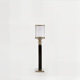 A refined and stately accent piece for contemporary and mid-century modern interiors, this large candle holder boasts monochromatic tones. A black finished sustainable mango wood column is supported by a square silver polished aluminium countering the dark finish. The glass candle holder is connected to the wooden stem with a rounded metal orb that elegantly transitions the square stem into round glass.