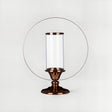 This large candle holder creates a fusion of traditional shapes with a distinctive modern twist. The brass finish metal body of the Boutique-styled candle holder is counters the clear glass holder with a matching trim around the rim coordinating with the plinth base. A distinctive aura like brass toned ring surround the top of the candle holder, adding warmth and stately feel to your interiors.