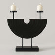 Handmade from black paulownia wood, this two candle holder features a semi-circular stand in rustic hues and texture. Black metal poles support the frame and complement two holders at the top with a small cutout in the centre.