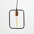 Black finish wireframe gently moulds to create the rectangular frame of this pendant light. A tubular bulb suspends through the sleek fixture, with copper finish detail giving a luxe effect.