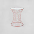 A series of slim rods rise from the base of the table, forming a concave shape that produces a corseted effect. These rods support a series of iron twigs that enhance this table's decorative credentials. A tempered glass surface completes the elegant impression that this table makes.