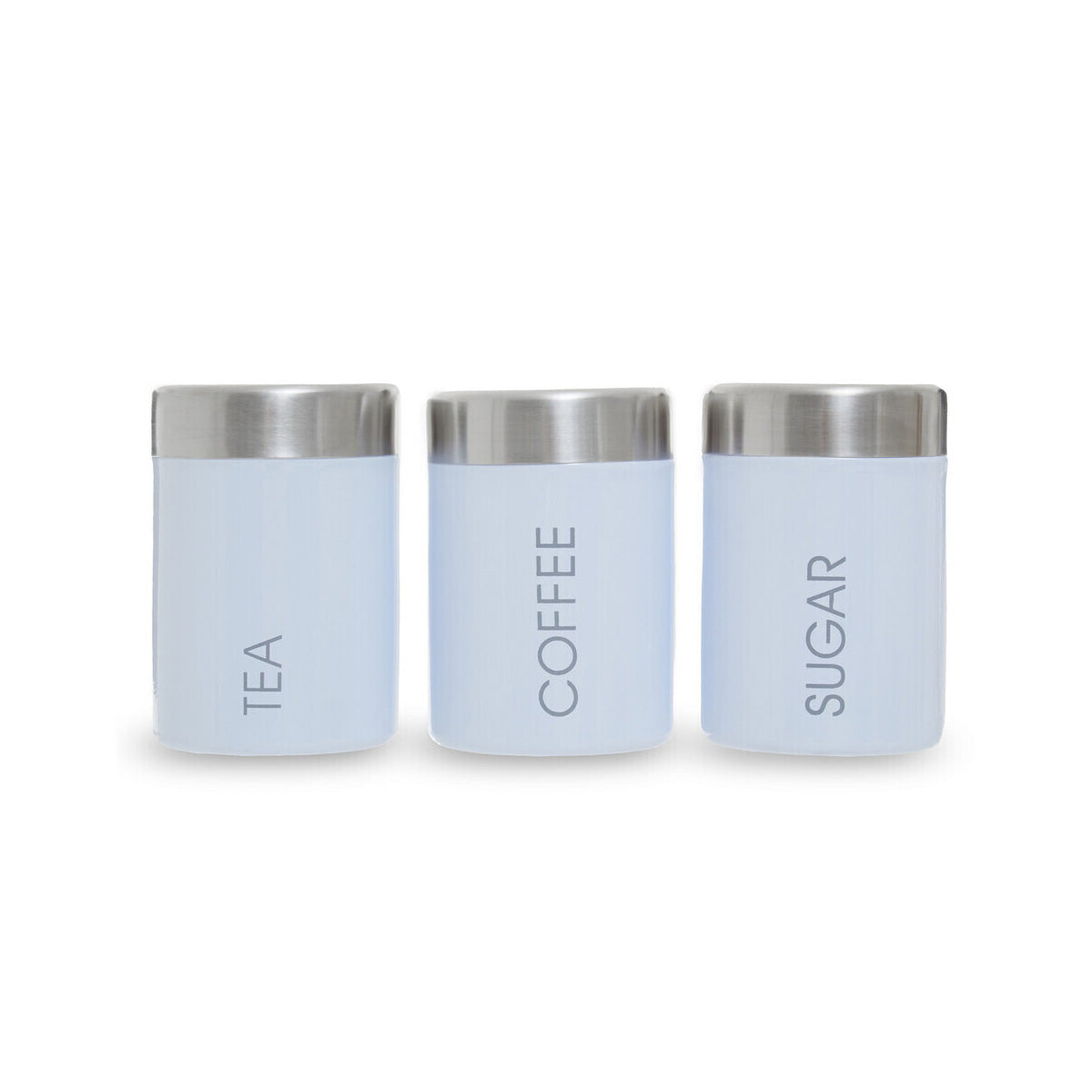 Each canister is made from water and scratch-resistant enamel, with a crisp white finish that allows the silver toned lettering to stand out clearly. Their satin stainless steel lids coordinate with the lettering, and pop into place securely thanks to the ridged rim on each canister.