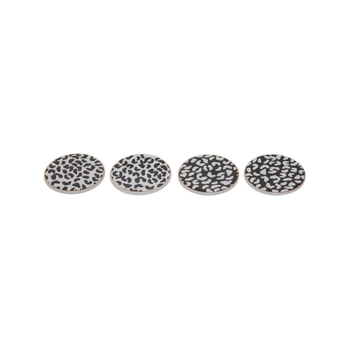 This set of 4 coasters features a leopard print design, in monochromatic pattern. Perfect for adding a touch of modern flair to your home, they provide both style and functionality by protecting your surfaces from moisture and stains.