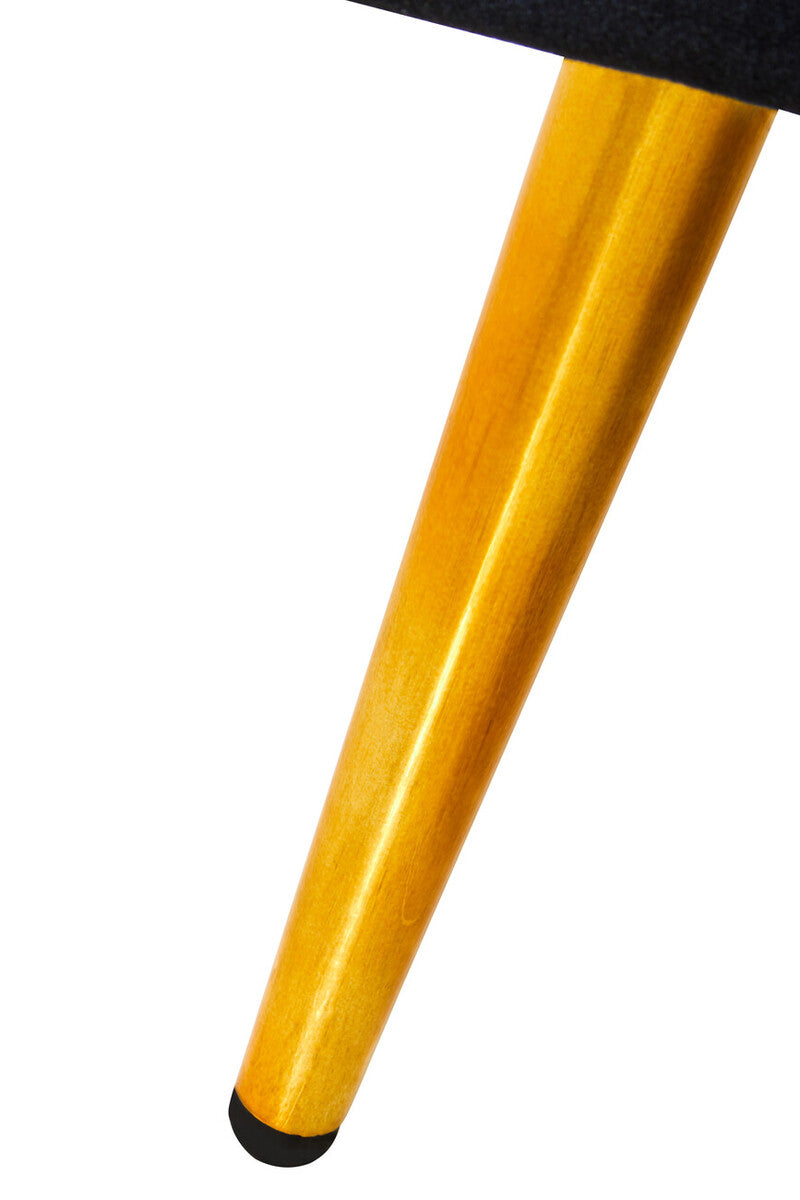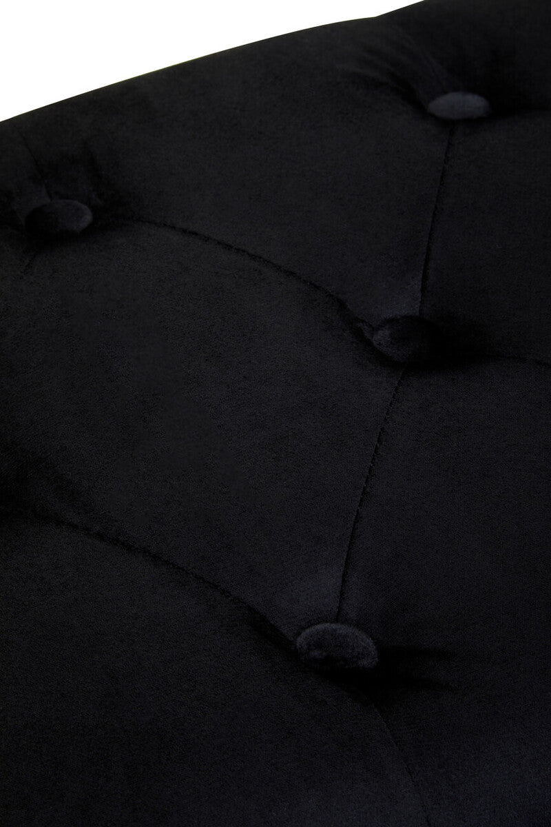 This storage bench is upholstered in elegant black velvet. The seat features plush cushioning with a tufted top that adds to its style. The angular gold finish legs enhance its visual appeal giving it a luxe aesthetic.