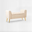 This storage bench is upholstered in elegant stone velvet. The seat features plush cushioning with a tufted top that adds to its style. The angular gold finish legs enhance its visual appeal giving it a luxe aesthetic.