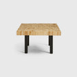 Cutout pieces of renewable teakwood are joined to form the rectangular top of this coffee table in rustic warmth and texture. , supported with a sleek black finish iron frame this table will complement any living space in your home.