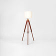 Made from brown wood, this modern floor lamp has a sleek tripod base with metal struts detail which helps in adjusting the height. The angular base contrasts the white linen shade that casts a luminous glow and softens the aesthetic.