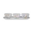 Elegant and chic, this serving set features sophisticated charm with its marble like pattern in muted colour palette and matte finish. The 3 rounded dip bowls are complemented by an oblong tray. Whether serving antipasti, small nibbles or tasty dip sauces - everything makes a big impression in this 4-piece set.