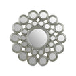 This contemporary wall mirror is comprised of different-sized, round metal frames joined together in a sequence like a flower. Each piece is complemented by a mirrored glass and has ridged lines that give it a texture.
