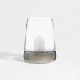 This candle holder boasts a fusion of nickel finish and glass that creates texture and visual interest. The clear glass is gently tapered upwards to create a classic hurricane aesthetic, supported with a round nickel finish base in a hammered effect.