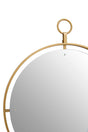 A contemporary design with a round mirror secure to a circular gold metal frame complements modern aesthetics and brings an understated charm to any space.