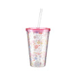 The tapered cup has a double walled build which keeps its contents cool, and boasts a colourful floral design. The plastic is clear to match the straw, the latter with a catch that prevents it from slipping out of the pink lid.