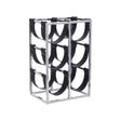 This wine rack combines sturdy silver finish stainless steel with black leather effect bands to create a decorative yet functional look. The rack creates a classic feel with angular sections that neatly nestle six bottles, ensuring ease of access.