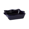 The Modern Retro square casserole dish features wavy, undulating edges and is vibrant blue with a high gloss finish. The combination of durable stoneware, dark blue colour, and a chic gloss finish paired with ergonomic handles makes it stylish and practical.
