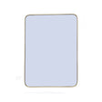 The minimal rectangular frame has rounded corners that soften its otherwise straight lines. Its thin edges draw the eye to the mirrored glass when observed face-on, but from the side the frame's depth can be appreciated. The reflective surface is set into the thick frame, reflecting its golden colour back into the room.