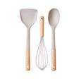 This 3pc kitchen tool set is heat resistant and remains gentle on non-stick cookware, preventing scratches. Each utensil includes a stone grey silicone head complemented by a contoured wooden handle.