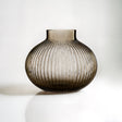 This champagne-finish glass vase showcases a textured body in a spherical design with extruding trim. The smooth curves exude a decorative appeal, complementing modern-style interior settings. Display it above the hallway table or shelving unit as a standalone decorative piece or along with floral arrangements. This modern vase will add a touch of sophistication to your decor setting.