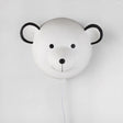 Designed in the shape of a friendly bear's face, this wall-mountable ceramic night light is a delightful and functional addition to a child's room. It features a smooth, white ceramic body with black accents for the eyes, nose, and the outline of its ears. The bear's face is adorned with a pattern of small perforated holes, which allow a gentle light to shine through, creating a soft, comforting glow.