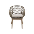 The chair is skillfully hand-woven and exhibits a rounded profile with gliding armrests and an open-frame textured back. The foam-padded grey seat provides optimum comfort, while tapered legs lend stability and mid-century aesthetics to the living area.