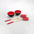 Each porcelain bowl and dish is durable for everyday use, while their vivid red finish inside and black outside, is accentuated by elegant written Chinese detail adding to its authentic style.