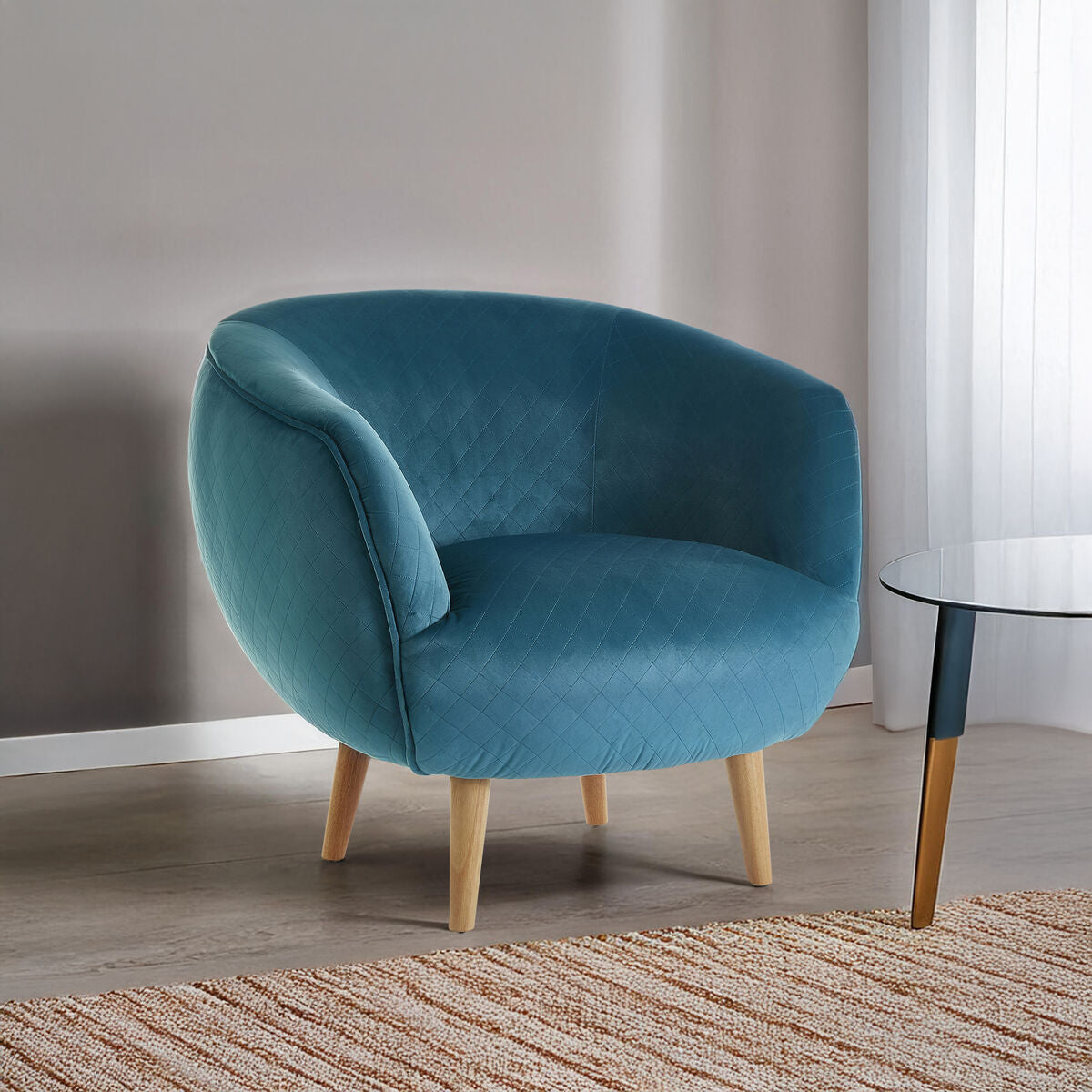 This plump, low profile chair stands poised on legs made from sustainable pine wood. The golden grained legs complement the teal coloured upholstery. Diamond stitching across the fabric adds texture while lending a subtle geometric touch to its aesthetic. A contemporary accent chair that adds a splash of colour to the living room.