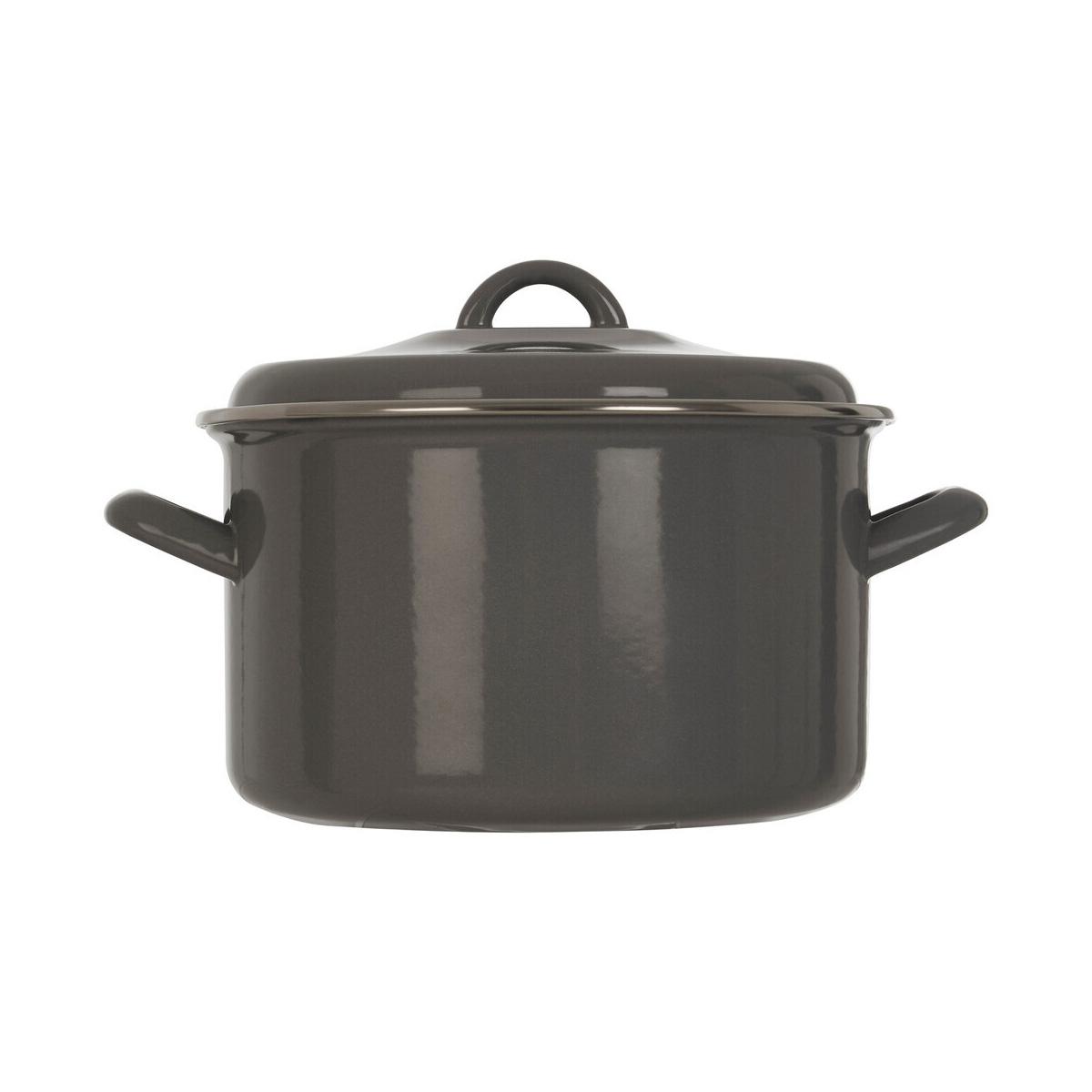 The Porter large grey enamel coated casserole dish comes with a matching lid. Its dual handles provide a secure grip while cooking or moving it from the stove. A sleek, metallic silver finish on the rim adds a decorative touch while the cool grey exterior contrasts with its smooth white inner surface.