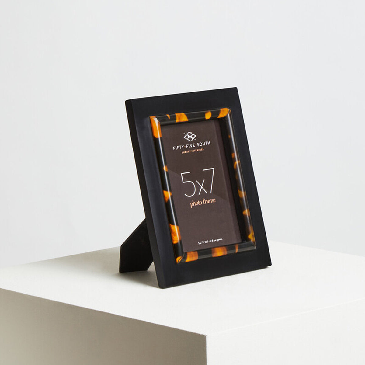 This 5 x 7 inch black photo frame is expertly crafted from high-quality resin with an ergonomic stand on the back. The inner frame features a chic faux tortoise shell detail making it suitable for contemporary and rustic interiors. A stylish way of adding a personal touch to your living room, bedroom, or home office space, thanks to its sleek look and durable build.