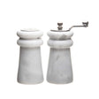 Both pieces boast a traditional design, with tapered bodies and carved heads that make them comfortable to hold. Formed from natural white marble, their black veining allows them to be styled with monochrome dinnerware and placemats. Chrome lids add a sleek edge, while a large handle on the pepper mill makes grinding easy.