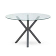 This round dining table features a sleek and minimalist silhouette with its clear top and dark base making it ideal for contemporary and modern dining spaces. The clear glass top of this elegant dining table showcases the grey powder coated base in starburst design creating a chic accent in your home elevating the dining experience when paired with comfortable chairs.